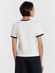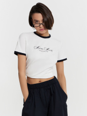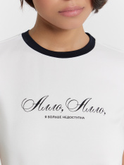 Футболка женская Mark Formelle x Ольга Бузова. Лимитированная коллекция "Мне можно все". Укороченная модель прилегающего силуэта — это стильное и комфортное решение для создания современного и изящного образа. Круглая горловина добавляет классический акцент, а короткие рукава с манжетами подчеркивают аккуратность и завершенность дизайна. Нижний срез изделия обработан швом вподгибку, что обеспечивает долговечность и эстетичный вид. Модель выполнена из эластичного хлопка, который мягко прилегает к коже, дарит комфорт и позволяет телу дышать. Эта футболка станет отличным выбором для теплых дней и стильных ансамблей, гармонично сочетаясь с другими элементами гардероба. Рекомендуем!