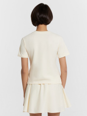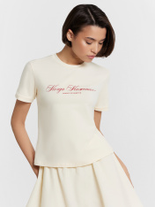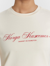 Футболка женская Mark Formelle x Ольга Бузова. Лимитированная коллекция "Мне можно все". Укороченная модель прилегающего силуэта — это стильное и комфортное решение для создания современного и изящного образа. Круглая горловина добавляет классический акцент, а короткие рукава с манжетами подчеркивают аккуратность и завершенность дизайна. Нижний срез изделия обработан швом вподгибку, что обеспечивает долговечность и эстетичный вид. Модель выполнена из эластичного хлопка, который мягко прилегает к коже, дарит комфорт и позволяет телу дышать. Эта футболка станет отличным выбором для теплых дней и стильных ансамблей, гармонично сочетаясь с другими элементами гардероба. Рекомендуем!