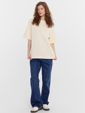 Женская футболка оверсайз – идеальный выбор для стильного и комфортного повседневного образа. Модель с круглой горловиной и короткими рукавами придает современный вид, а спущенная линия плеча добавляет нотку непринужденности. Выполненная из мягкой иприятной хлопковой кулирки, эта футболка обеспечивает ощущение комфорта и легкости при носке. Отлично сочетается с различными элементами гардероба, позволяя создавать разнообразные и стильные образы.