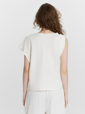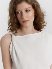 Эта женская блузка свободного силуэта — стильный и оригинальный элемент гардероба, идеально подходящий для создания современных и утонченных образов. Асимметричная форма горловины привносит в модель необычный акцент, делая ее запоминающейся и выразительной. Драпировка с перекрутом на правом плече добавляет изысканности, подчеркивая уникальный дизайн. Срезы горловины и проймы обработаны швом вподгибку, что обеспечивает аккуратный и долговечный внешний вид изделия. Слегка укороченный крой делает блузку особенно подходящей для сочетания с высокими юбками, брюками или джинсами, создавая стильные и гармоничные образы. Материал, состоящий из льна и района, сочетает в себе природную текстуру и мягкость. Лён обеспечивает воздухопроницаемость и комфорт, а район добавляет изделию гладкость и пластичность. Такой материал делает блузку практичной и приятной в носке, особенно в тёплое время года. Эта модель прекрасно подойдёт для повседневных и вечерних образов, подчеркивая индивидуальность и вкуссвоей обладательницы. _x000D_ _x000D_ _x000D_