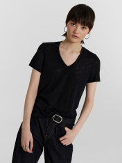 Джемпер прямого силуэта, свободный. Горловина V-образной формы, глубокая, обработана бейкой из основного полотна. Рукава втачные, корткие. Нижние срезы джемпера и рукавов обработаны швом вподгибку.