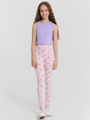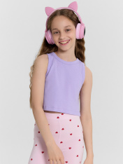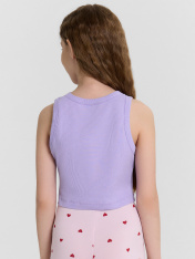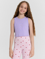 Топ для девочек прилегающего силуэта. Горловина круглая. Проймы и горловина окантованы бейкой из основного полотна. Низ изделия обработан швом в подгибку.