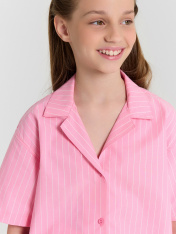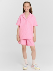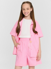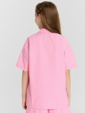Блузка для девочек. свободного силуэта из ткани. По переду обработана застежка на пуговицы d=10mm и петли. Рукава короткие, втачные, слегка спущены. Нижние срезы изделия и рукавов обработаны швом в подгибку.
