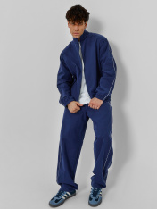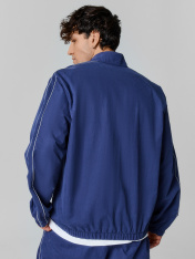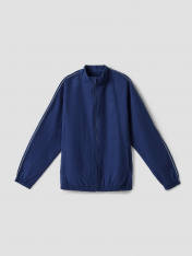 Толстовка свободного кроя, с центральной застежкой-молнией, с воротником-стойкой. Плечо слегка спущено. _x000D_ От шва втачивания воротника до низа рукава отрезные детали-лампасы, в швы притачивания лампасов вставлены канты из отделочной ткани._x000D_ Рукава втачные длинные, с цельнокроеными манжетами с эластичной тесьмой внутри. _x000D_ По переду боковые прорезные карманы с листочкой._x000D_ По низу изделия эластичная тесьма._x000D_ _x000D_