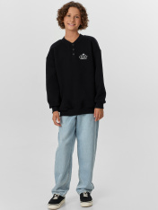 Свитшот свободного силуэта. Рукава длинные, втачные. Линия плеча спущена. Перед и спинка цельнокроенные. Горловина круглой формы. В горловину втачен воротник-стойка из рибаны. По переду изделия застежка на кнопки d=15 мм. По низу рукавов и джемпера притачены манжеты и пояс из рибаны.