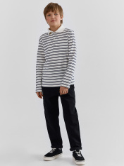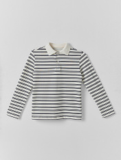 Поло для мальчиков прямого силуэта. Рукава втачные длинные. Плечо слегка спущено. Горловина округлый формы с рубашечным воротником из довяза DOV-16, DVC-85/001-0/5 . Шов обработки горловины - закрыт х/б тесьмой 10 мм 10TGY-O. По переду обработана застежка на петли и пуговицы d=10 mm. _x000D_
