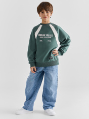 Свитшот для мальчиков свободного силуэта. Рукава длинные, реглан, с отрезными манжетами из _x000D_ рибаны. По переду отрезные детали вдоль шва притачивания рукава реглан. Горловина круглой _x000D_ формы, обтачка из трикотажного полотна рибаны 2*2. Шов втачивания рибаны по спинке закрыт _x000D_ х/б тесьмой. По нижнему срезу изделия притачен _x000D_ пояс из рибаны. _x000D_