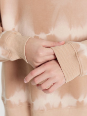 Джемпер свободного силуэта. Рукава длинные, втачные. Линия плеча спущена. Перед и спинка цельнокроенные. Горловина круглой формы обработана обтачкой из рибаны. Шов притачивания обтачки распошит. По низу рукавов и джемпера притачены манжеты и пояс изрибаны.