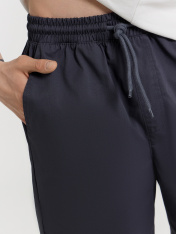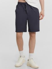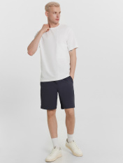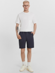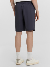Шорты мужские изготовлены из ткани. Шорты прямые, посадка средняя. Пояс отрезной с эластичной тесьмой внутри. По переду пробиты петли и втянут шнур с эглетами (8EKXWC-1). На левой детали переда имитация гульфика. По переду карманы с отрезными бочками. Нижние срезы шорт обработаны швом вподгибку.