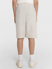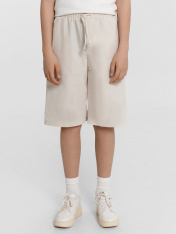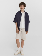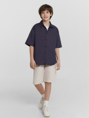 Шорты для мальчиков из ткани. Шорты с классической линией талии. Силуэт прямой. Пояс отрезной. Боковые швы перенесенны вперед. Карманы «хулиганы» На внешней стороне пояса пробиты петли, и втянут шнур 8PXС-2. Низ шор обработан швом в подгибку.