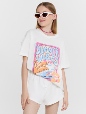 Шорты для девочек. Шорты укороченные, с высокой посадкой. Пояс цельнокроеный с эластичной тесьмой внутри. Снаружи пробиты петли и втянут шнур 8PXС-2. В боковых швах кант из трикотажного кулирного полотна. Нижние срезы шорт обработаны швом в подгибку.