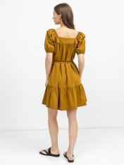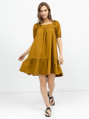 Однотонное женское платье А-образного силуэта из ткани поплин. Вырез в форме каре, короткие расширенные рукава собраны на резинку. Пояс на талии акцентирует внимание на женственность фигуры. Нижний ярус платья – широкая рюша с волнообразной сборкой.Рекомендуем для легких летних образов!