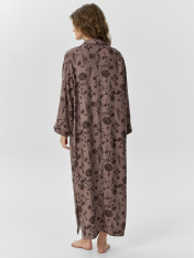 Женское домашнее платье прямого силуэта — это идеальное сочетание комфорта и сдержанной элегантности. V-образная горловина с отложным воротником придает образу мягкий акцент, делая его чуть более собранным, даже в рамках повседневной домашней одежды. Центральная застежка на пуговицах делает модель не только практичной, но и визуально структурированной, а укороченные рукава с манжетами добавляют завершенности и легкого ретро-оттенка. Длина ниже колена и разрезы в боковых швах обеспечивают свободу движений и подчеркивают удобство посадки, при этом визуально вытягивая силуэт. Обработка низа платья швом в подгибку сохраняет форму и эстетичный вид после множества стирок. Вискозная ткань приятно струится по телу, дарит ощущение мягкости и прохлады — именно то, что хочется чувствовать дома.
