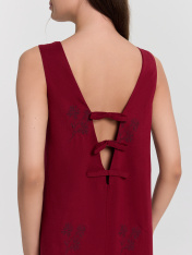 Это стильное платье A-силуэта — идеальный выбор для тех, кто ценит элегантность и комфорт. Мини-длина подчеркивает легкость образа, а круглая горловина и V-образный вырез на спинке делают модель более изящной. Декоративные бантики на спинке делают модель особенной, добавляя нотку романтичности. Главное преимущество этого платья — натуральные материалы. Вискоза и лен обеспечивают отличную воздухопроницаемость, позволяя коже дышать даже в жаркую погоду. Лен придает ткани прочность и долговечность, а вискоза делает ее мягкой и приятной на ощупь. Благодаря этим свойствам платье остается комфортным в течение всего дня и сохраняет аккуратный вид после множества стирок.