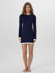 Модель прилегающего силуэта мягко подчеркивает фигуру, сохраняя свободу движений. Глубокий оттенок добавляет образу благородства, а круглая горловина с имитацией двойной обтачки и длинные рукава создают завершенный силуэт. Дизайн дополнен оригинальной деталью по низу платья и рукавов — имитацией поддетого платья, что придает модели стильную многослойность.<br>_x000D_ <br>_x000D_ Если вы ищете женское домашнее платье, которое сочетает уют и эстетику, эта вещь станет идеальным выбором. Женская домашняя одежда из мягких дышащих тканей идеальна для утреннего кофе, отдыха с книгой или вечерней релаксации. Практичный крой и качественные материалы делают платье универсальным элементом гардероба, который легко сочетается с тапочками и уютными кардиганами.<br>_x000D_ <br>_x000D_ Женское домашнее платье — это не просто предмет одежды, а проявление заботы о себе и своем настроении. Наслаждайтесь каждым моментом в гармонии с собой и окружающей обстановкой._x000D_