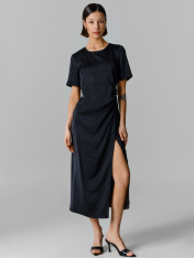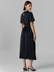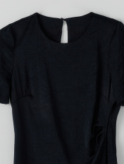 Платье полуприлегающего силуэта, перед и спинка цельнокроенные. Передняя деталь на запах, с завязками. На передней детали заложены складки. Рукава короткие, горловина обработана обтачкой из основного полотна. По спинке вырез-капелька на пуговицу 10мм и жилку тканую (жилка Jw34493, WT4-4). Низ изделия и рукавов в подгибку.