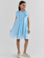 Платье А-силуэта. Спинка и перед цельнокройные. Вырез горловины круглый. По спинке застежка-капелька на одну петлю WT4-6 и пуговицу d=10mm. Вдоль верхней части проймы рукава расположено три слоя рюш, которые переходят с переда на спинку. Подкладка из трикотажного кулирного полотна.
