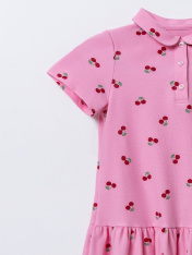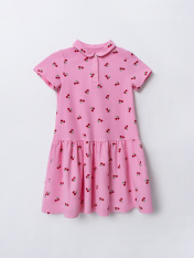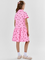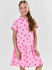 Платье для девочек А-силуэта. С короткими рукавами. С воротником-поло. Линия втачивания воротника закрыта бейкой из основного полотна. Застежка на пуговицы. (d= 10 mm.) Низ изделия и рукавов обработан на 2-х игольной плоскошовной машине швом в подгибку.