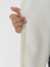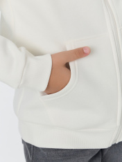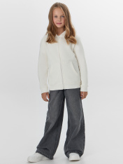 Жакет из трикотажного футера с теплым подчесом. Спущенная линия плеча гарантирует свободу движений. Прямой свободный силуэт, уютный капюшон, длинные рукава на манжетах, удобный карман-кенгуру, центральная застежка на молнию – эта модель наверняка понравится вашей девочке. _x000D_