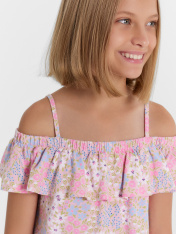 Очаровательный летний сарафан А-силуэта на тонких бретелях для девочек. Одной из главных изюминок является декоративный волан со сборкой, элегантно украшающий плечевую зону. Этот нежный и изящный акцент придает наряду особую женственность и привлекательность. Тонкие бретели обеспечивают максимальный комфорт и свободу движений, позволяя чувствовать себя легко и непринужденно. Высококачественный хлопок гарантирует долговечность и практичность изделия. Универсальная длина выше колена делает этот детский сарафан идеальным выбором как для прогулок, отдыха и повседневной носки. Станет настоящей находкой для юных модниц. Рекомендуем!