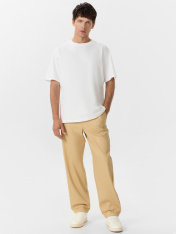 Брюки мужские изготовлены из ткани._x000D_ Брюки прямые, посадка средняя. Пояс цельнокроёный с эластичной тесьмой внутри. С внутренней стороны пробиты петли и втянут шнур с застроченными концами (10PXC-1). На левой детали переда имитация гульфика. По переду карманы с отрезными бочками. Нижние срезы брюк обработаны швом вподгибку. На деталях спинки накладные карманы. _x000D_