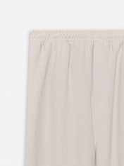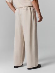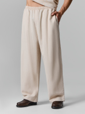 Брюки мужские изготовлены из ткани._x000D_ Брюки свободные, посадка средняя._x000D_ Пояс отрезной с эластичной тесьмой внутри. На внутренней части пояса пробиты петли и втянут шнур 10 PXC-1 с застроченными концами. _x000D_ На деталях переда боковые карманы в швах. Подкладка карманов из основного полотна. По переду имитация гульфика._x000D_ На задней половинке брюк справа прорезной карман с листочкой._x000D_ Нижние срезы обработаны в подгибку с закрытым срезом._x000D_ _x000D_ _x000D_