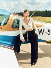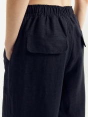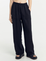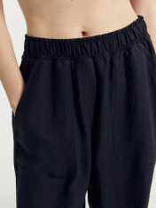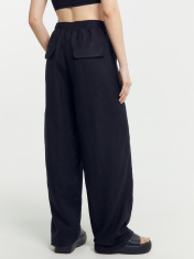Брюки женские прямого силуэта из ткани со льном. Пояс отрезной из основной ткани с эластичной тесьмой внутри, по поясу проложены отделочные строчки. На передних деталях фигурные накладные карманы и отстрочка имитация гульфика. На задних деталяхфигурные клапаны. Брюки полной длины и средней посадки.