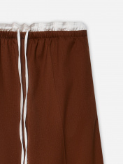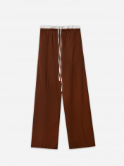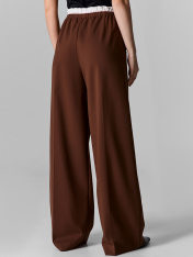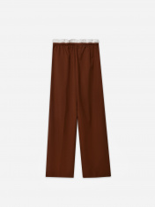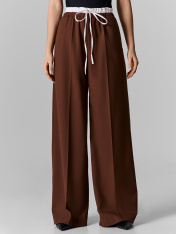 Брюки женские свободного силуэта из ткани. Пояс цельнокроеный с эластичной тесьмой внутри, по верху с отрезной рюшей из сатина. В рюше пробиты петли и вставлен шнур из сатина._x000D_ Карманы в боковом шве. На задней детали вытачка._x000D_ На брюках заутюжены стрелки. Брюки полной длины._x000D_