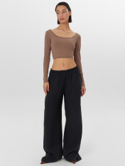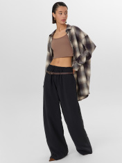 Брюки прямые свободные, посадка средняя. Пояс цельнокроеный с эластичной тесьмой внутри (20мм 20RV). С внутренней стороны пояса пробиты петли и втянут шнур-бейка из основного полотна. На деталях переда обработаны карманы-хулиганы. Подкладка карман из основного полотна. На правой детали переда имитация гульфика. Нижние срезы обработаны швом вподгибку с закрытым срезом.