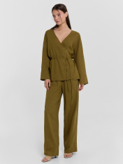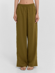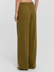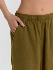 Женские брюки свободного силуэта — идеальный выбор для тех, кто ценит комфорт и натуральные материалы. Рами и лиоцелл делают ткань прочной, дышащей и приятной к телу, обеспечивая легкость и удобство даже в жаркую погоду. Практичный эластичный пояс со шнуром из основного полотна позволяет регулировать посадку, а боковые карманы добавляют функциональность. Широкие манжеты на нижних срезах придают брюкам стильный акцент, делая их универсальными для разных образов. Дополните эти брюки подходящим верхом из коллекции Mark Formelle, чтобы создать гармоничный и стильный комплект.