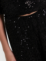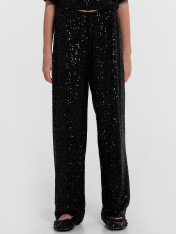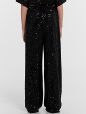Брюки свободного силуэта. Пояс обработан жаккардовой тесьмой JT-35. Подкладка из трикотажного кулирного полотна. Низ изделия обработан швом в подгибку.