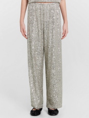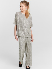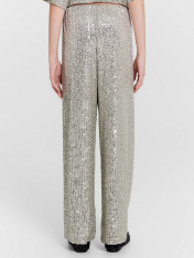 Брюки свободного силуэта. Пояс обработан жаккардовой тесьмой JT-35. Подкладка из трикотажного кулирного полотна. Низ изделия обработан швом в подгибку.