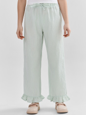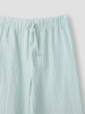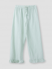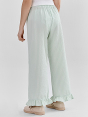 Брюки прямые свободные, посадка средняя. Пояс отрезной, с эластичной тесьмой внутри. С внешней стороны пробиты петли и вставлен шнур из основного полотна. _x000D_ По нижнему срез брюк - рюша._x000D_