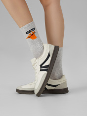 рис.2668 Женский носок с высоким плотным бортом и рисунком в виде котика с надписью.
