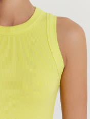 Топ женский из рибаны._x000D_ Узкое плечо, углубленная пройма._x000D_ Силуэт облегающий, длиной ниже уровня талии._x000D_ Перед и спинка цельнокроеные._x000D_ Горловина круглая, плотно прилегающая к шее._x000D_ Горловина и проймы окантованы широкой бейкой из основного полотна._x000D_ Низ изделия обработан швом вподгибку на плоскошовной машине.