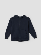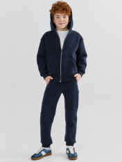 Жакет для мальчиков прямого силуэта с капюшоном. Капюшон на подкладке из основного полотна. Шов втачивания капюшона закрыт х/б тесьмой. Рукава втачные, линия плеча спущена. Притачные манжеты по низу рукавов и притачной пояс из рибаны. По переду застежка молния, карман кенгуру.