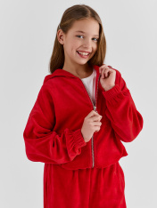 Толстовка детская свободного силуэта с капюшоном, спинка цельнокроеная. Горловина круглой формы. Капюшон двойной . Плечо слегка спущено, пройма углублена. Низ рукава и изделия обработан в подгибку с резиной внутри 30RV. Перед с центральной застежкой на молнию._x000D_ Брюки свободного силуэта с высокой посадкой. Пояс цельнокроеный с эластичной тесьмой внутри 30RV. Карманы в боковых швах. Низ брюк обработан швом вподгибку.
