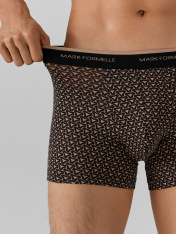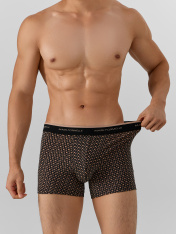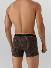 Мужские трусы-боксеры с узором — идеальное сочетание комфорта и стиля. Модель облегающего силуэта без боковых швов выполнена из мягкой хлопковой кулирки._x000D_ Состав с преобладанием хлопка обеспечивает естественную вентиляцию, гипоаллергенность и мягкость, а добавление эластана придает ткани оптимальное растяжение, сохраняя посадку после стирок. _x000D_ Эластичный пояс с жаккардовым узором мягко фиксирует трусы, не оставляя следов на коже. Универсальный черный цвет с декоративным узором делает эти боксеры подходящими для повседневной носки, занятий спортом или отдыха. Практичный и стильный выбор для тех, кто ценит качество и внимание к деталям._x000D_