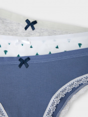 Стильный набор женских трусиков слипов разных цветов из высококачественного хлопка - популярная модель женского белья. Невероятно удобные, благодаря своей невысокой посадке, они пользуются заслуженной любовью покупательниц. Изготовлены из натурального материала, дышащего, мягкого, гипоаллергенного - идеального для повседневной носки. По поясу и ножкам - нежная кружевная лента. Помимо длительного и полного ощущения комфорта, материал отличается долговечностью и сохраняет вид даже после многочисленных стирок. Цвет трусиков останется ярким, рисунок не поблекнет и долго будет радовать вас. Продуманная анатомическая конструкция, плоские швы и деликатные резиночки делают эту модель подходящей для спорта и на каждый день. _x000D_ В наборе: 3 шт._x000D_