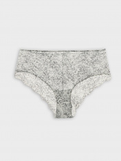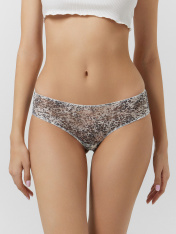 Трусы женские, средняя линия талии, шорты. Передняя деталь выполнена из кружевного полотна. Задние детали выполнены из кружева. Подкладка ластовицы из хлопка, отлетная по верхнему срезу. Верхний срез обработан тесьмой с зубом. Нижние срезы переднейдетали обработаны жилкой.