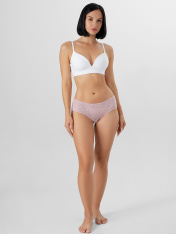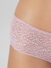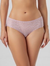 Трусы женские, средняя линия талии, шорты. Передняя деталь выполнена из кружевного полотна. Задние детали выполнены из кружева. Подкладка ластовицы из хлопка, отлетная по верхнему срезу. Верхний срез обработан тесьмой с зубом. Нижние срезы переднейдетали обработаны жилкой.