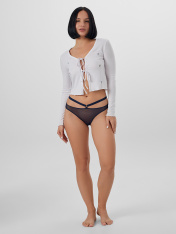 Трусы женские классического силуэта со средней посадкой из эластичной сетки. Передняя и задняя детали цельные. Подкладка ластовицы из кулирной глади, настрочена по переднему краю. По центру к передней детали прикреплена через кольцо декоративная эластичная тесьма. Талия и ножки обработаны эластичной тесьмой по лицевой стороне (жилка)._x000D_ _x000D_