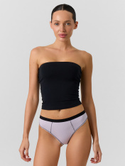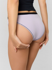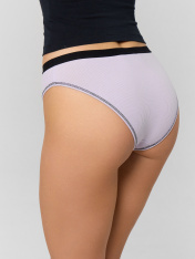 Трусы женские со средней линией талии силуэта «слип» из трикотажного полотна рибана. Передняя деталь с рельефами, по которым проложены декоративные строчки. Ластовица из кулирной глади отлетная по переднему срезу._x000D_ Задняя деталь цельная._x000D_ По талии эластичная тесьма._x000D_ Ножки окантованы бейкой из рибаны с эластичной тесьмой внутри, с отделочными строчками с верхним застилом.