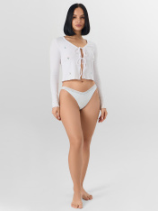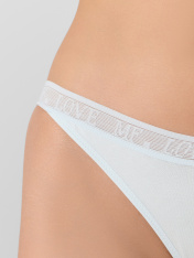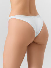 Трусы женские, силуэт бразилиана, из кулирного полотна, со средней посадкой. Передняя деталь из кулирного полотна цельная, с V-образной линией талии. Задняя деталь трусов со швом. Подкладка ластовицы из кулирного полотна, отлетная по переднему срезу. _x000D_ Нижние срезы обработаны эластичной тесьмой 15 мм ( ловабль F1-15, девсел 794W) . По талии настрочена эластичная тесьма 25 мм (тесьма с/без логотипа DT1-25, девсел 14000К)