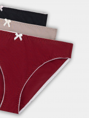 Набор из трех женских трусов-слипов — это идеальное сочетание комфорта и нежности для повседневной носки. Модели со средней посадкой выполнены из мягкого трикотажа, который обеспечивает идеальную посадку и воздухообмен. Верхний и нижние срезы обработаны эластичной тесьмой для комфортного прилегания, не оставляющего следов на коже. Украшением каждого трусика служит изящный декоративный элемент — бантик, расположенный по центру передней детали. Эта милая деталь добавляет образу женственности и шарма. <br>_x000D_ <br>_x000D_ Подкладка ластовицы из основного материала обеспечивает дополнительный комфорт и гигиеничность. Благодаря составу с добавлением эластана трусы сохраняют форму после стирок и мягко облегают фигуру. Этот набор станет прекрасным дополнением вашей коллекции нижнего белья.