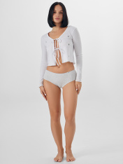 Трусы женские шорты, выполнены из рибаны. Передняя и задняя детали цельные._x000D_ Подкладка ластовицы выполнена из кулирного полотна отлетная по переднему срезу._x000D_ Нижние срезы обработаны бейками из основного полотна с верхним застилом._x000D_ Верхний срез обработан эластичной тесьмой 10 мм (жилка тканая Wt4-10, девсел 13460 W) на п/ш с верхним застилом в край тесьмы. _x000D_