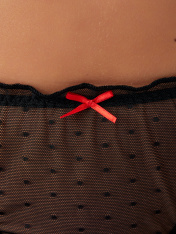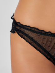 Трусы женские, силуэт - слипы, выполнены из трикотажного полотна сетки. Задняя и передняя деталь цельнокроеные. Подкладка ластовицы из кулирного полотна, отлетная по врхнему срезу. Верхние и нижние срезы обработаны закруткой, и собраны со сборкой наэл. тесьму 6мм (жилка Wt4-6, девсел 13460W) зигзагом.