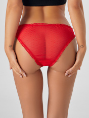 Трусы женские, силуэт - слипы, выполнены из трикотажного полотна сетки. Задняя и передняя деталь цельнокроеные. Подкладка ластовицы из кулирного полотна, отлетная по врхнему срезу. Верхние и нижние срезы обработаны закруткой, и собраны со сборкой наэл. тесьму 6мм (жилка Wt4-6, девсел 13460W) зигзагом.