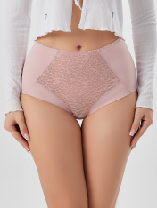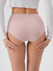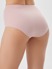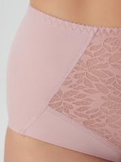 Трусы женские, силуэт макси, выполнены из трикотажного полотна микрофибра. Передняя деталь в центре декорирована кружевным полотном, на подкладке из монокапрона. Нижние детали переда двойные. Внутри по ножкам стоит эл тесьма 6мм (жилка Wt4-6, девсел13460W). Подкладка ластовицы выполнена из кулирного полотна. Швы передних деталей, ластовицы обработаны на плоскошовной машине с верхним застилом. Срезы по ножкам зад. дет., ластовице обработаны эл. тесьмой с зубом 10мм (жесткая c/з WTE1-10 devsel 558W ) зигзагообразной строчкой. По верхнему срезу эл. тесьма 12мм (жесткая с/з WTE1-12, devsel 558W).