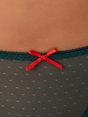 Трусы женские, силуэт, бразилиана, выполнены из кружевного полотна. Рюша по бокам переходящая на спинку. Подкладка ластовицы из кулирного полотна, отлетная по верхнему срезу. Верхний срез обработан эл тесьмой 8мм ( с зубом KTE5-8 Arteks E2699 ).Задняя деталь с центральным швом. По ножкам передней и задней детали эл тесьма 6мм (жилка Wt4-6, девсел 13460W) обработана зигзагообразной строчкой. Край рюши обработан закруткой._x000D_